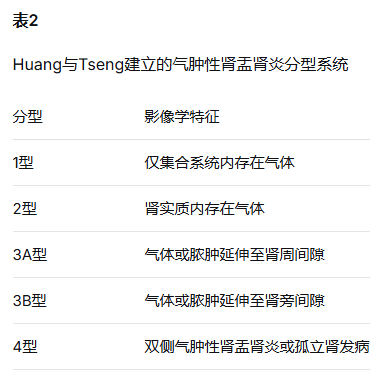 气肿性肾盂肾炎需通过影像学确诊。常规X线可显示肾区气泡影;超声特征表现为肾脏增大伴实质内高回声灶;CT则是确诊的金标准,能精确显示实质内气体范围与分布(证据等级3b,推荐强度B)。2000年Huang等建立的CT分型系统(见表2)根据气体分布位置进行分级,已成为指导治疗决策最常用的标准。